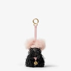 قلادة للحقيبة مصنوعة من قماش الجاكار مع طباعة FF باللون الأسود وصوف الشيرلنج (shearling) باللون الوردي.قلادة صغيرة على شكل كلب مع حزام من الجلد ومشبك إغلاق مخصص بعلامة Fendi.مزينة بضفائر من الجلد بدرجات مختلفة من اللون نفسه، مع قبعة محبوكة من الصوف تحمل كرتين من صوف الشيرلنج (shearling) باللون الوردي ورقبة من الجلد باللون الوردي.زينة معدنية باللون الذهبي.قلادة شخصية ومرحة تضفي لمسة من الأناقة على أي حقيبة في المجموعة.