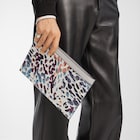 حقيبة مسطّحة بحجم متوسط مع سحّاب.مصنوعة من الكانفاس مع طباعة FF باللون الأبيض مع طبعة Fendi Falena متعددة الألوان منخفضة اللمعان.تفاصيل من الجلد باللون الرمادي الداكن.زينة معدنية بلمسة نهائية من البلاديوم (palladium).