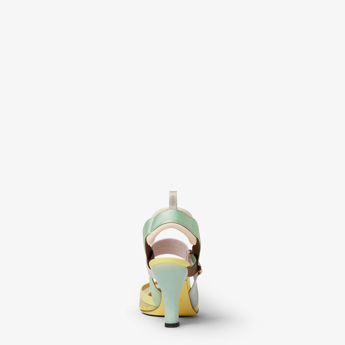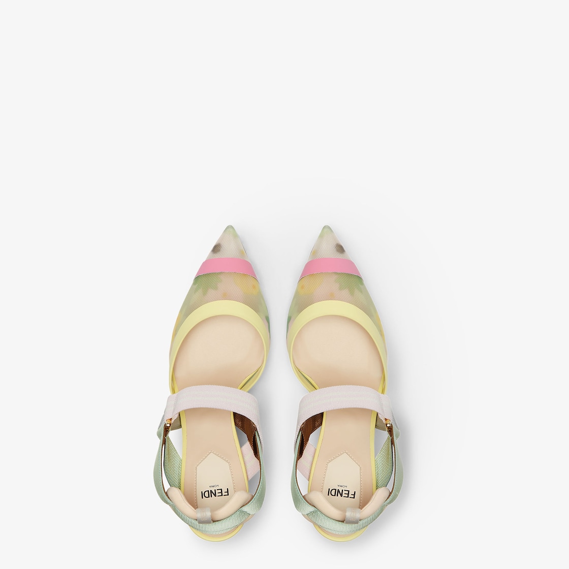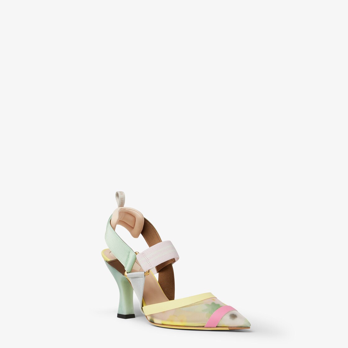حذاء Colibrì بشريط مطاطي خلفي انسيابي وأنثوي مع أشرطة مطاطية تلتف حول القدم.النعل الخارجي مزيّن بزيادات مطاطية.مصنوع من الشبك مع طبعة Fendi Bouquet متعددة الألوان.تُضفي الحشوة المبطّنة والجزء الخلفي للحذاء لمسة رياضية.كعب مغطى بالجلد باللون الأخضر الفاتح.