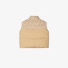 جيليه للمواليد (من 0 إلى 24 شهراً) بدون أكمام من النايلون (nylon) باللون البيج، مع تفاصيل من قماش الجاكار تضم شعار FF على الكتفين بدرجات مختلفة من اللون نفسه.حشوة داخلية من الزغب وحروف Fendi مطرزة على الجهة الأمامية.