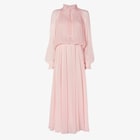 فستان طويل انسيابي برقبة عالية، وفتحة رقبة عميقة على شكل حرف V، وأربطة أمامية للحصول على مقاس مخصص.أكمام طويلة ورباط على الخصر.مصنوع من الشيفون كريبون (crepon chiffon) متعدد الألوان.مبطّن بلون متناسق.