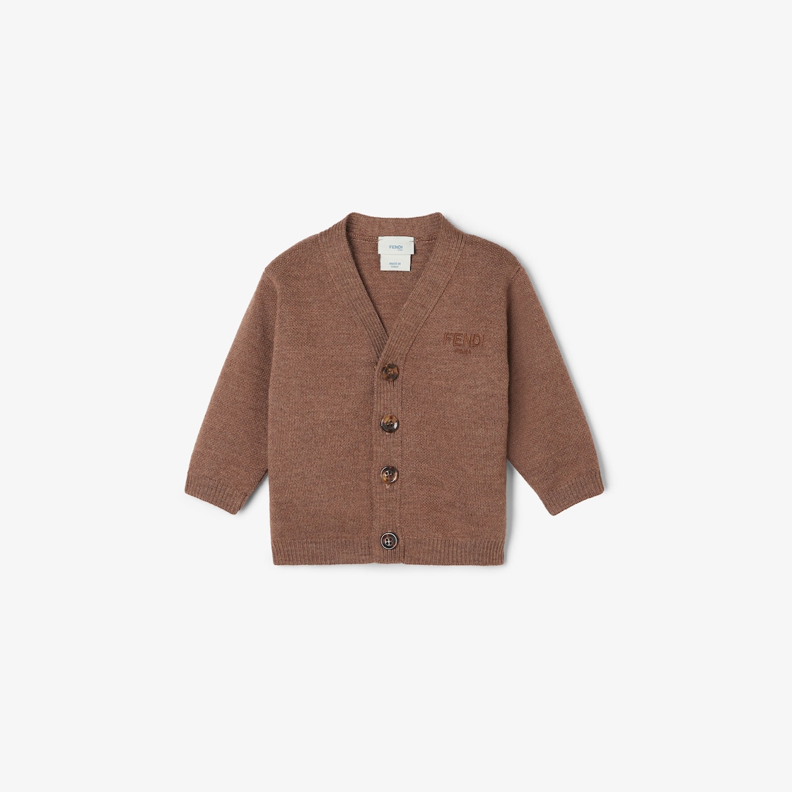 كارديغان للمواليد (من 0 إلى 24 شهراً) من الصوف باللون البني مع علامة Fendi مطرزة بدرجات مختلفة من اللون نفسه على الجهة الأمامية.