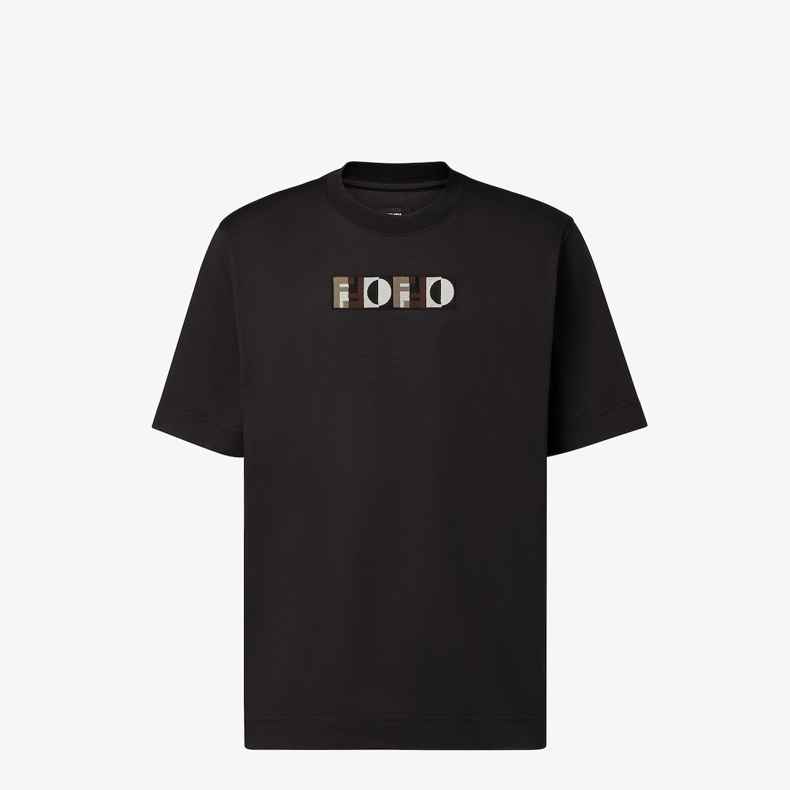 تي شيرت بأكمام قصيرة ومقاس عادي ورقبة مدوّرة. مصنوع من القطن %100 باللون الأسود. مزيّن بعلامة Fendi Optical ثلاثية الأبعاد مطرزة على الجهة الأمامية بالألوان البني والأبيض والأسود.