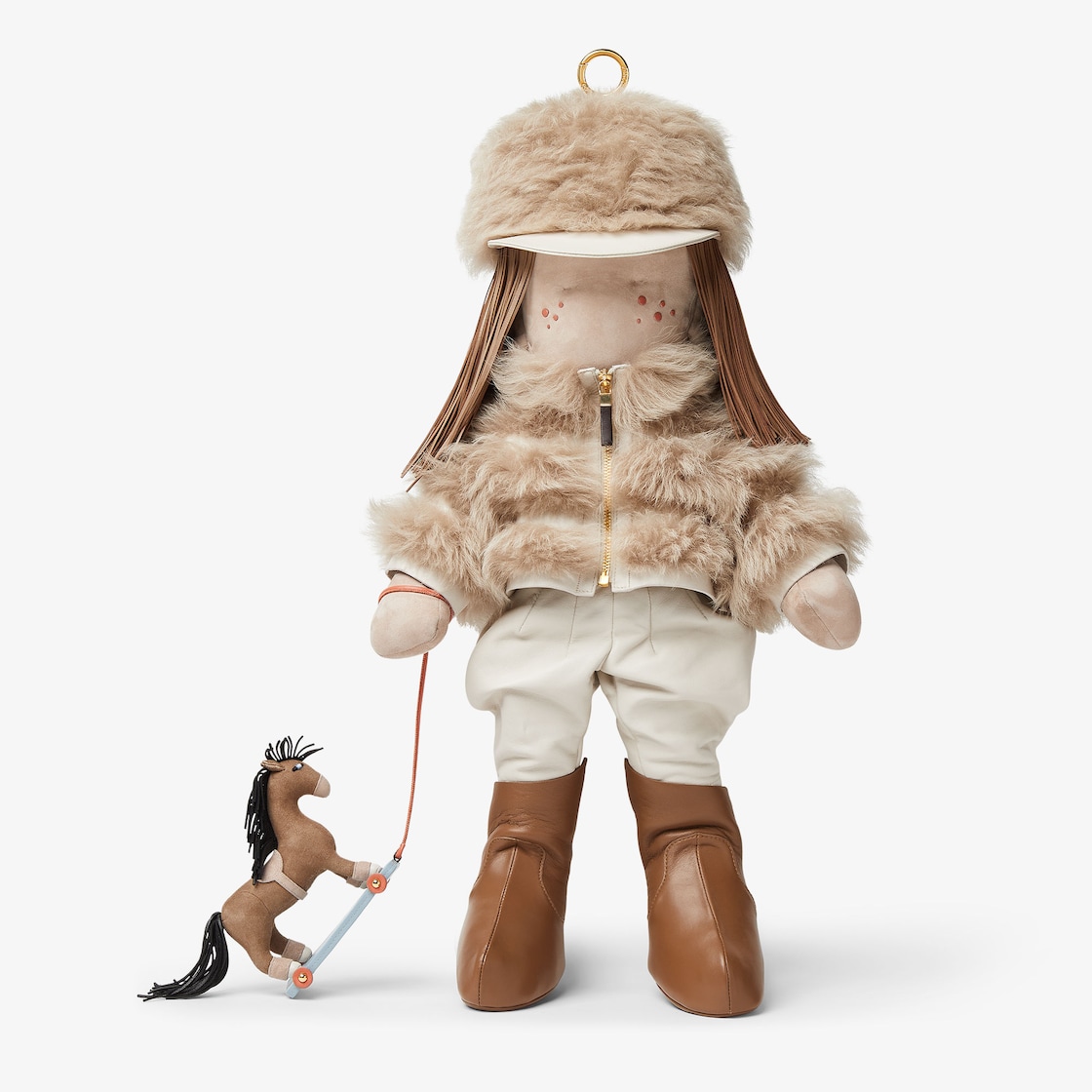 قلادة صغيرة Silvia ماكسي من قماش Alcantara مع شعر من الجلد بملمس مخملي يمكن تمشيطه في اتجاهين. قبعة من صوف الشيرلنج (shearling) بطرف من الجلد. تي شيرت من الجيرسيه وسترة bomber صغيرة من الجلد وصوف الشيرلنج (shearling). سروال من الجلد وبوتس لركوب الخيل من الجلد. شريط من الجلد مع مشبك وعلامة على الجهة الخلفية من الرأس. قلادة صغيرة بحجم ميني على شكل حصان من الجلد وجلد سويد (suede).