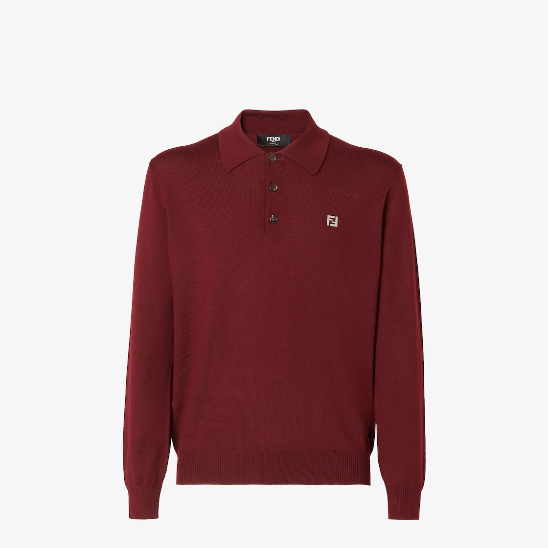 قميص بولو بأكمام طويلة.يتميز هذا التصميم برقبة كلاسيكية مع إغلاق بأزرار.مصنوع من الصوف المحبوك باللون العنّابي.مزين بطباعة FF مايكرو من معدن بلمسة نهائية من البلاديوم (palladium) في الجهة الأمامية.