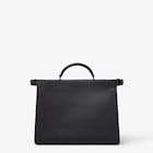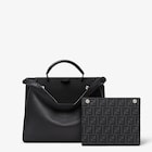 حقيبة Peekaboo ISeeU بحجم متوسط مصنوعة من جلد العجل كويو رومانو (Cuoio Romano) باللون الأسود مع 713 درزة يدوية علوية كبيرة بدرجات مختلفة من اللون نفسه، رمز لحرفية Selleria الأيقونية المتوارثة عبر أجيال من حرفيي فندي منذ عام 1925.