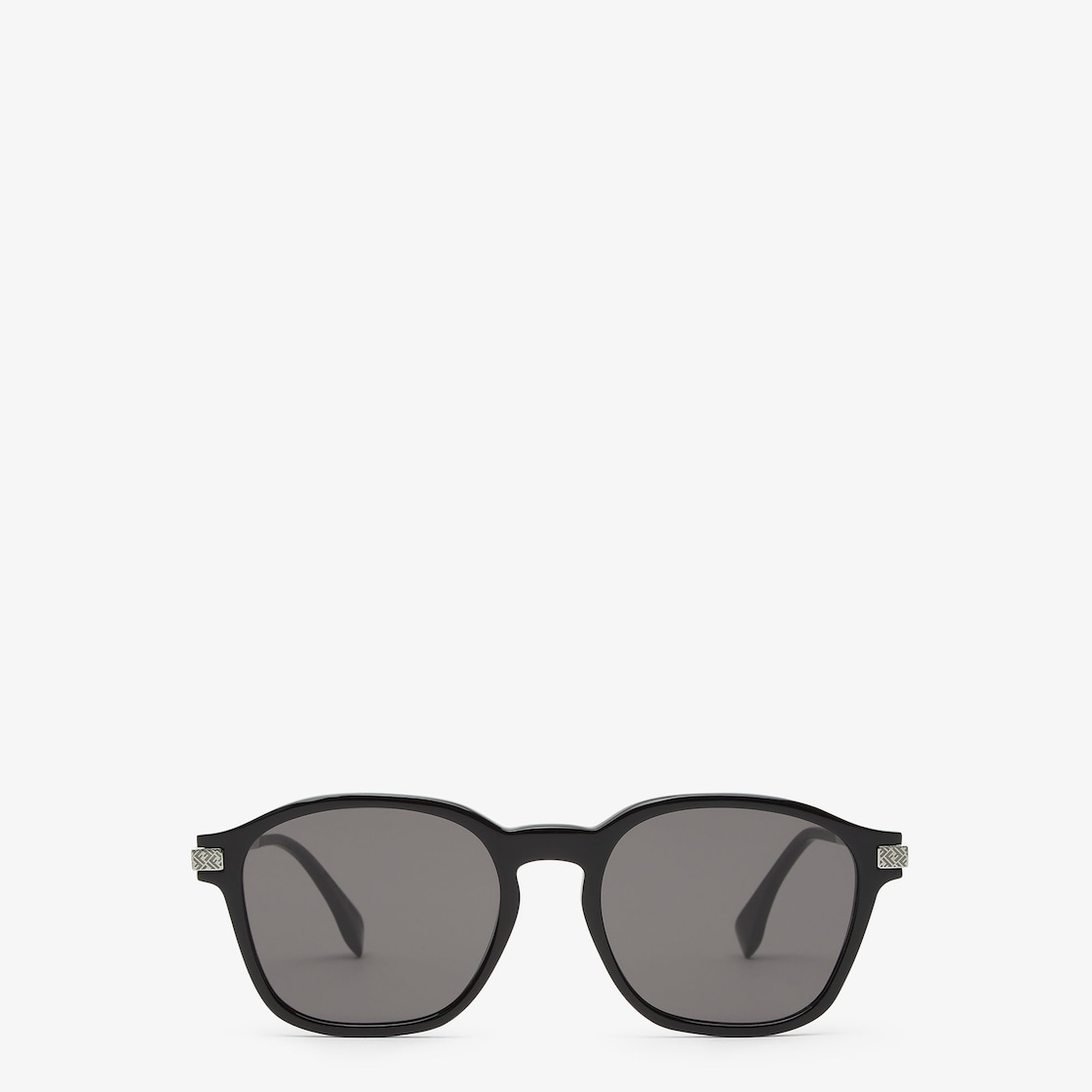 نظارات شمسية Fendi Essential مدوّرة من الأسيتات (acetate) باللون الأسود. ذراع معدني بلون الروثينيوم وعلامة FF محفورة. عدسات باللون الرمادي الداكن.