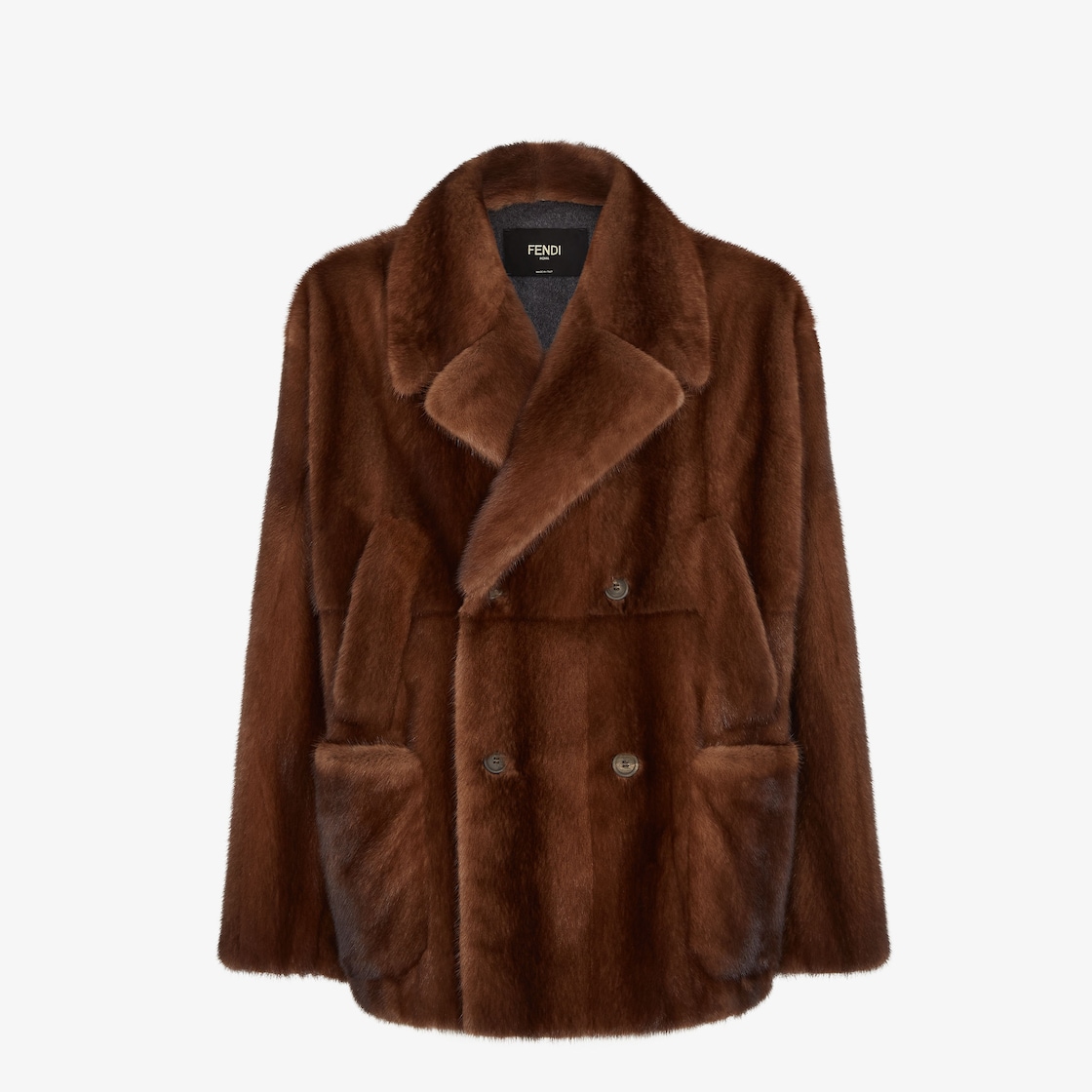 بلوزون بمقاس واسع وبصفين من الأزرار. رقبة بطيّة كبيرة، وجيوب مريحة لتدفئة اليدين، وجيوب خارجية على الطرف. أكمام طويلة منسدلة عند الأكتاف. إغلاق بأزرار. مصنوع من المنك (mink) باللون البني الطبيعي. بطانة متباينة من الكشمير باللون الرمادي.