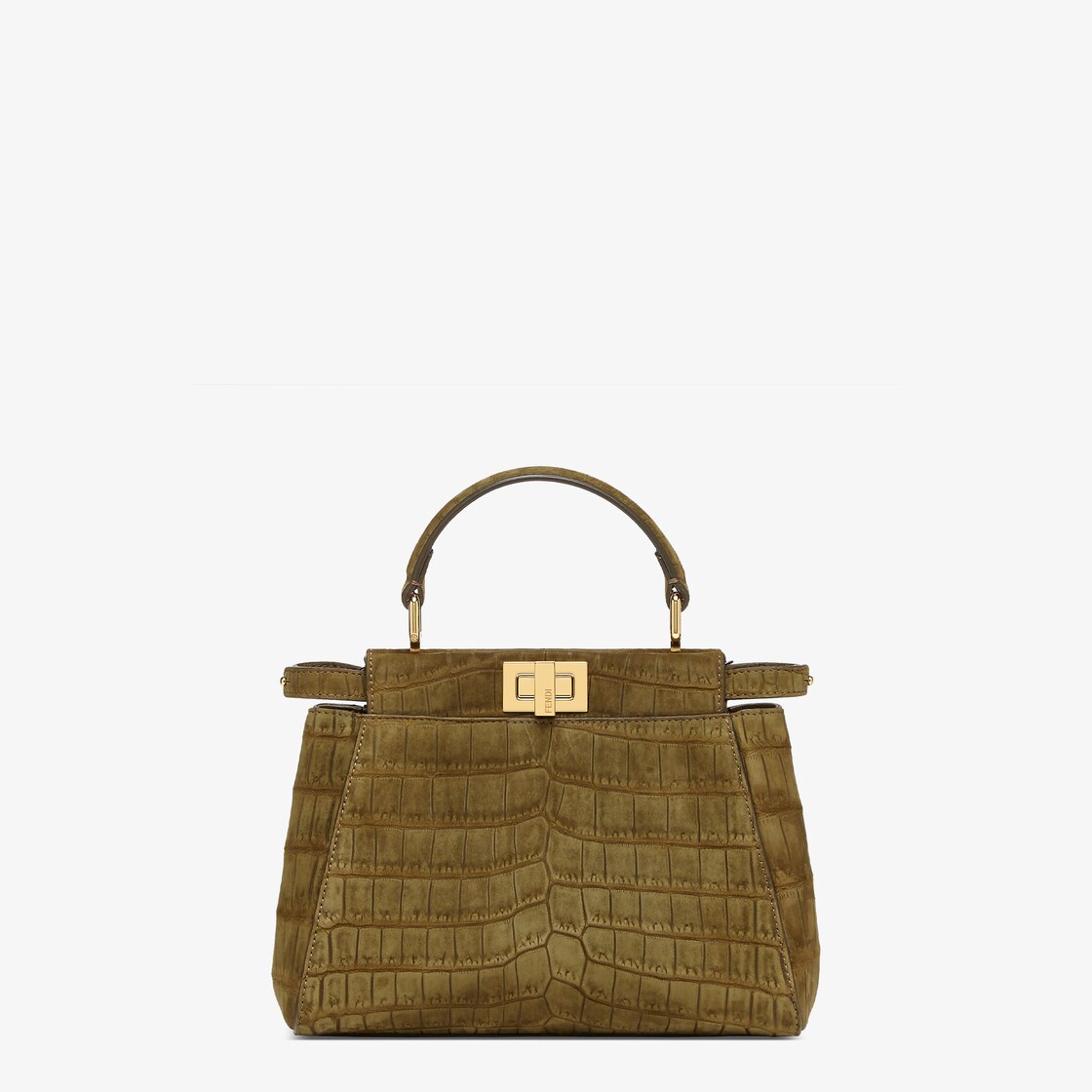 حقيبة Peekaboo الأيقونية بحجم صغير، مثال لحرفية فندي ولمستها الإبداعية. حقيبة Peekaboo، أيقونة خالدة تم إبداعها في عام 2009. مثل لعبة الأطفال peek-a-boo التي سميت الحقيبة تيمناً بها، تتلاعب الحقيبة بين الجمال الظاهر من الخارج والجمال المخفي في الداخل.