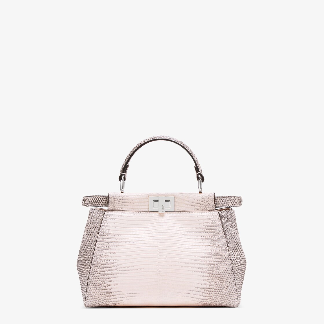 حقيبة Peekaboo الأيقونية بحجمٍ صغير. تأتي بخامةٍ من جلد السحلية الفاخر بدرجات اللون الوردي، وتصميم مزيّن بقفل اللف الكلاسيكي على كلا الجانبين.