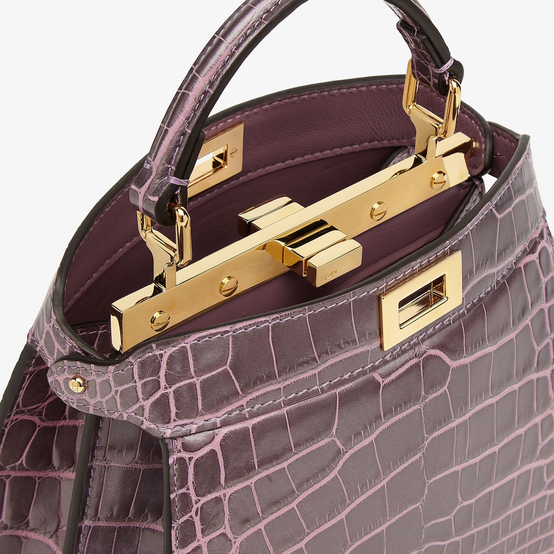 مصنوعة من جلد التمساح الفاخر باللون البنفسجي، ومصبوغة باليد لإضفاء لمسة رقيقة متغيّرة الألوان، باستخدام تقنية تفتيح لإبراز ملمس الجلد الطبيعي بدرجة اللون الوردي الأفتح.