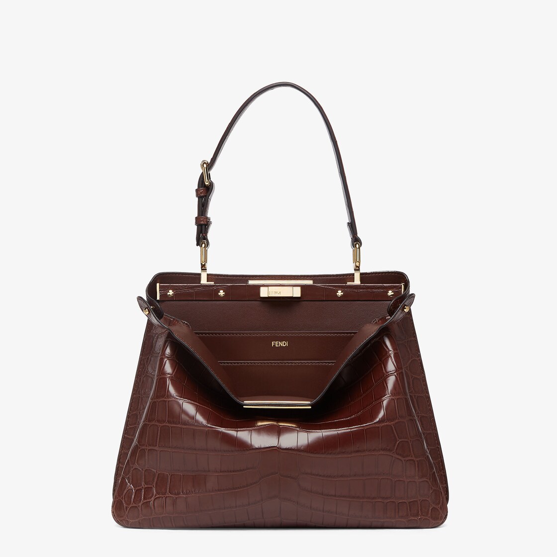 مصنوعة من جلد التمساح الناعم والفاخر باللون البني الداكن.