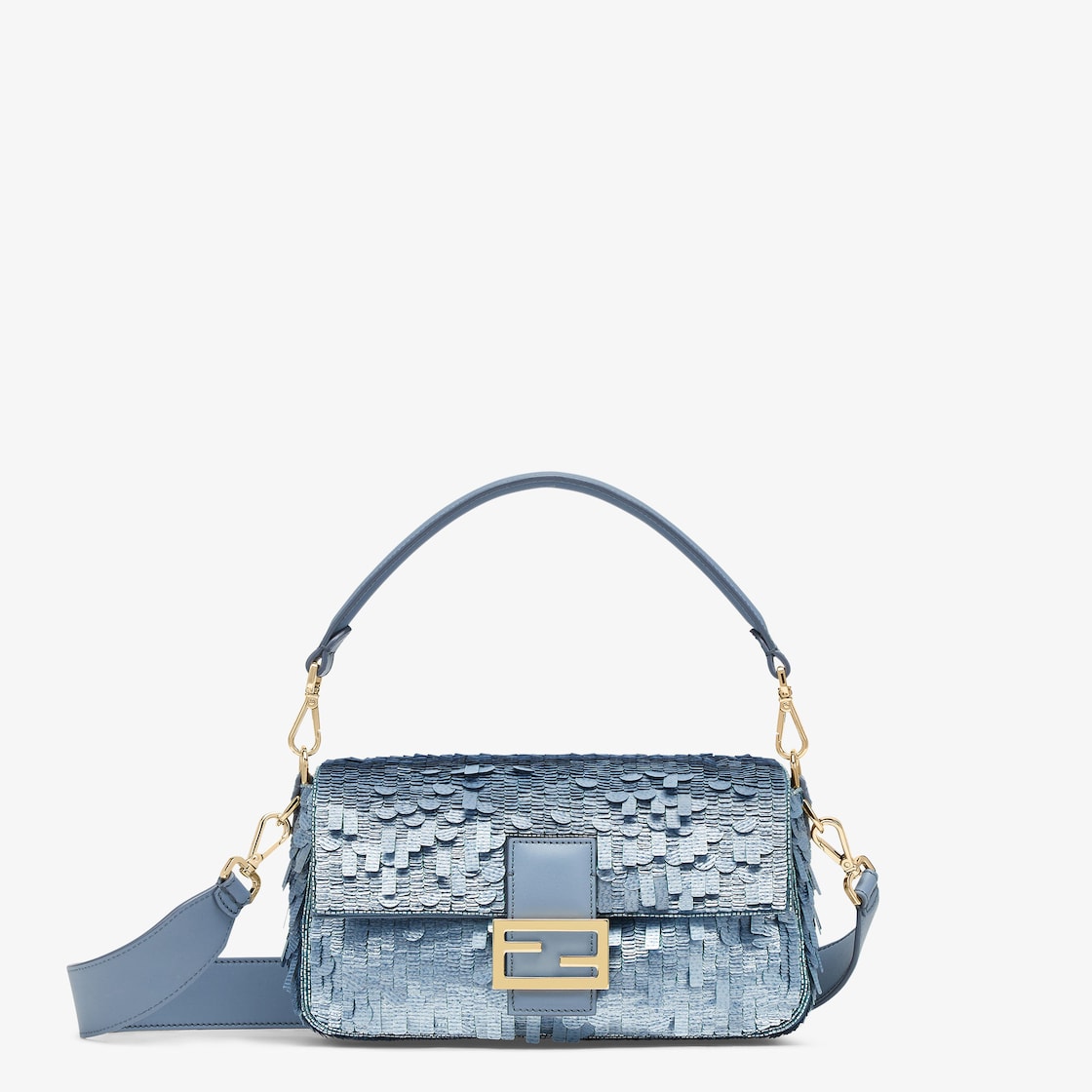 مطرّزة يدوياً بالخرز باللون الأزرق الفاتح بأشكال وأحجام مختلفة مع لمسة نهائية بمظهر الدنيم. تقليم من جلد العجل باللون الأزرق الفاتح ومشبك FF.