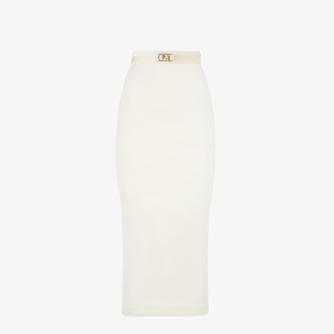 Close-fitting midi pencil skirt. Side zip fastening. Made of double viscose knit. One side is white, while the inside is branded with Fendi Brush lettering. The addition of Lycra® guarantees stretch and maximum comfort. Thin knitted belt with metal Fendi O’Lock buckle.