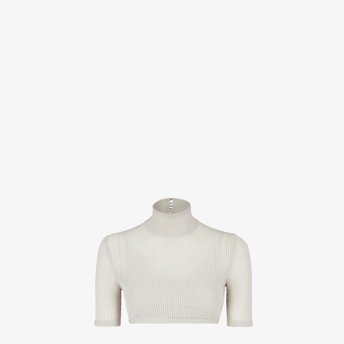 Cropped top with high neck and short sleeves. Teardrop fastening with small hooks at the back. Made of grey viscose with nylon inserts that create a sheer effect.