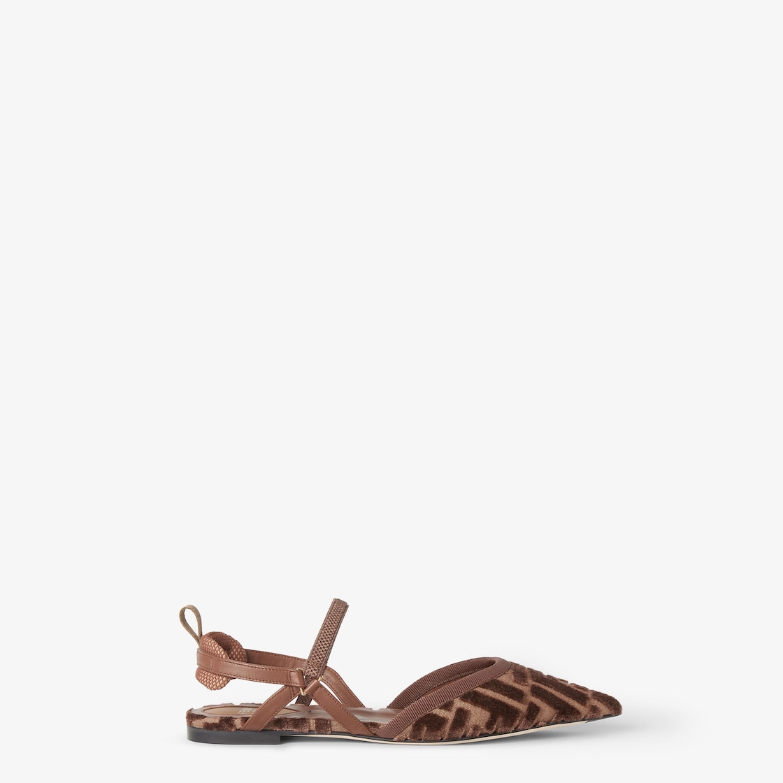 حذاء Colibrì Lite انسيابي وأنثوي مع أشرطة مطاطية ضيقة تلتف حول القدم. النعل الخارجي مزيّن بزيادات مطاطية. مصنوع من مُخمل الجاكار مع علامة FF باللون البني. تُضفي الحشوة المبطّنة والجزء الخلفي للحذاء لمسة رياضية.