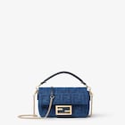 Small-size iconic Baguette® bag made of blue FF denim with a flocked texture. Decorated with an FF clasp.
