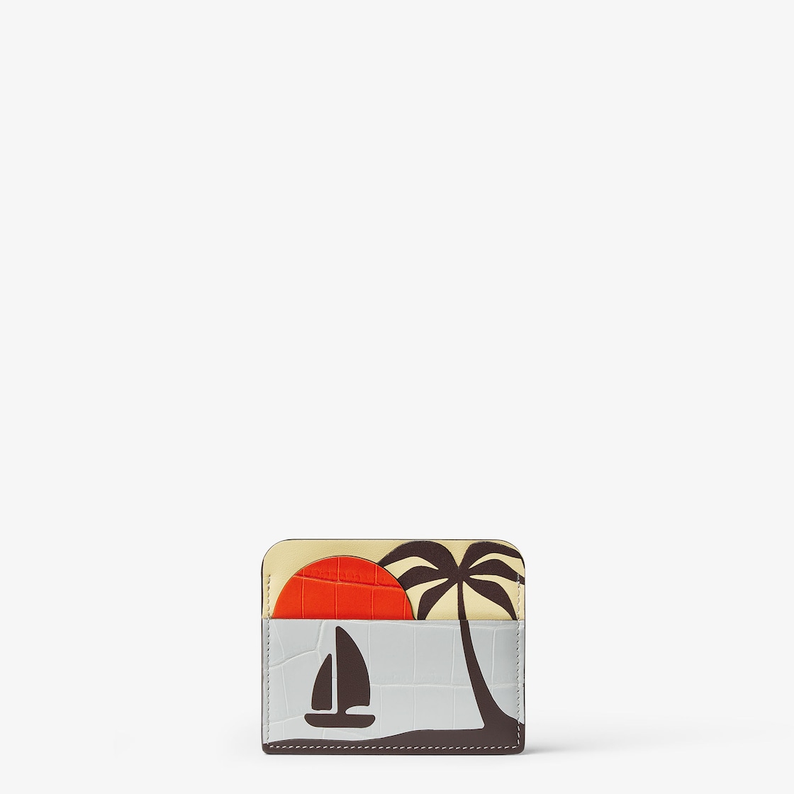 Fendi Postcard card holder with central compartment and six card slots. Made with a multicoloured inlay of luxurious crocodile leather and calfskin. The card slots have a contoured edge, playfully shaped to create an exotic landscape.