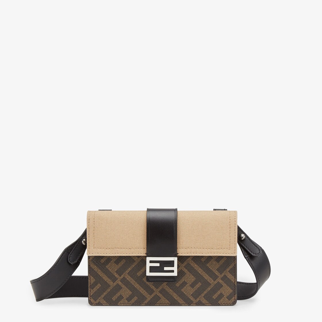 Baguette pouch with square flap and FF magnetic clasp. Can be worn on the waist, over the shoulder or cross-body by attaching the removable strap. Lining with zipped pocket. Made of fabric with FF motif. Embellished with natural canvas flap and black leather details. Palladium-finish metalware.