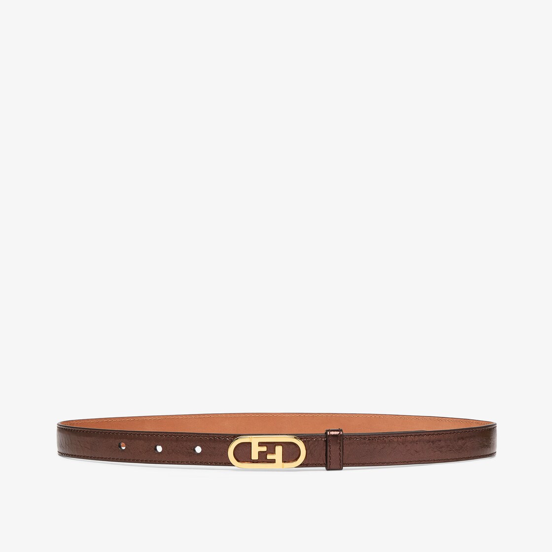 Narrow belt with loop and Fendi O’Lock stud buckle. Made of craquelé-effect brown leather. Gold-finish metalware.