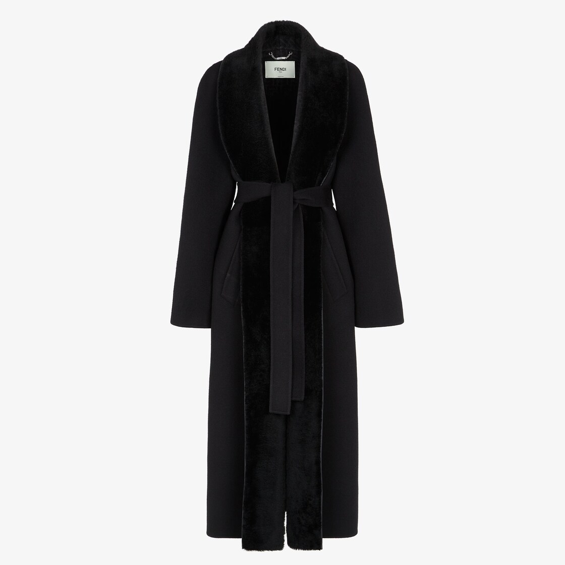 Wrap-style cocoon coat. Large shawl collar and welt pockets on the sides. Made of black wool double fabric. Embellished with a black shaved sheepskin collar and facing.