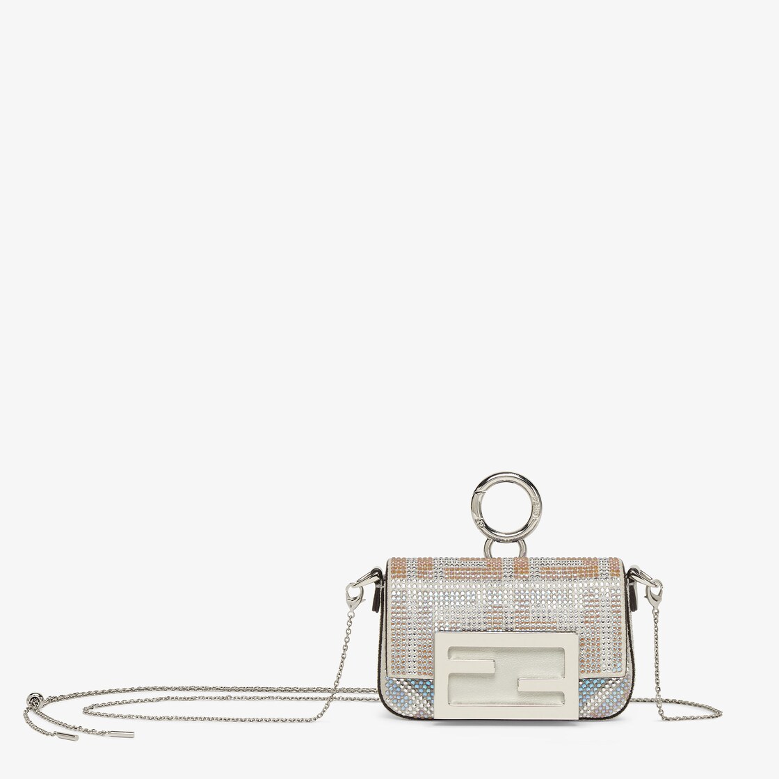 Nano version of the iconic Baguette bag, with flap and FF fastening with magnetic clasp. The clip allows it to be attached like a charm to larger bags or belts. It can also be worn cross-body thanks to the fine chain adjustable shoulder strap. Credit card holder flat pocket inside. Covered in iridescent crystals that create the FF motif. Metallic leather details. Palladium-finish metalware.