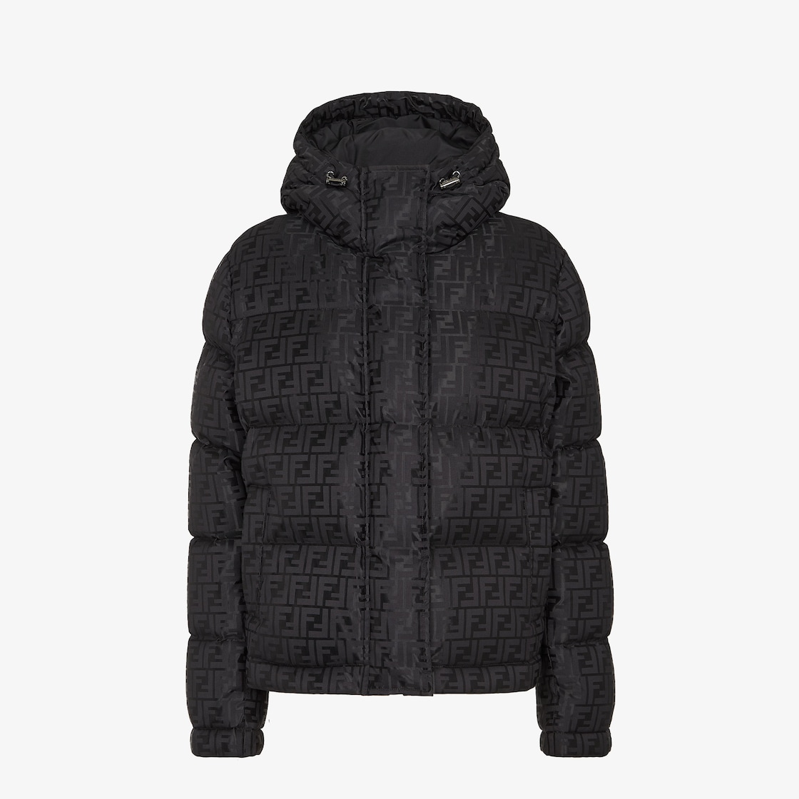 Puffer jacket with high collar and drawstring hood. Welt pockets. Concealed zip fastening. Made in a shiny jacquard nylon with iconic black FF motif.