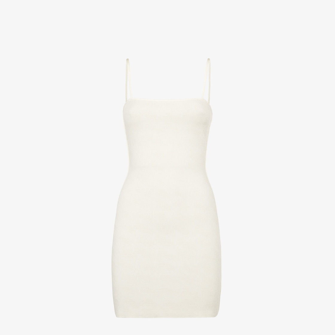 Short, sheath dress with thin shoulder straps and square neckline. Made of a double viscose knit. One side is white, while the inside is branded with jacquard Fendi Brush lettering. The addition of Lycra® guarantees stretch and maximum comfort.