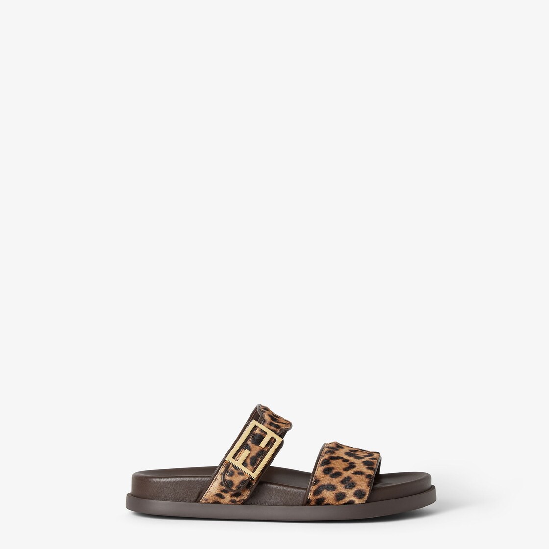 Flache Pantolette mit doppeltem Riemen und dekorativer FF Baguette-Schnalle. Aus Leder in Braun. Riemen mit Überzug behaartem Kalbsleder in Pferdefell-Optik mit Fendi Leo Animalier-Print in Braun. Beschläge aus Metall mit Finish in Gold-Optik.