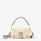 Aus Webband in Beige, fein bestickt und von Hand abgerundet, damit eine zarte Doily-Spitze entsteht. Details aus Elaphe-Leder in Felsgrau und FF-Schließe.