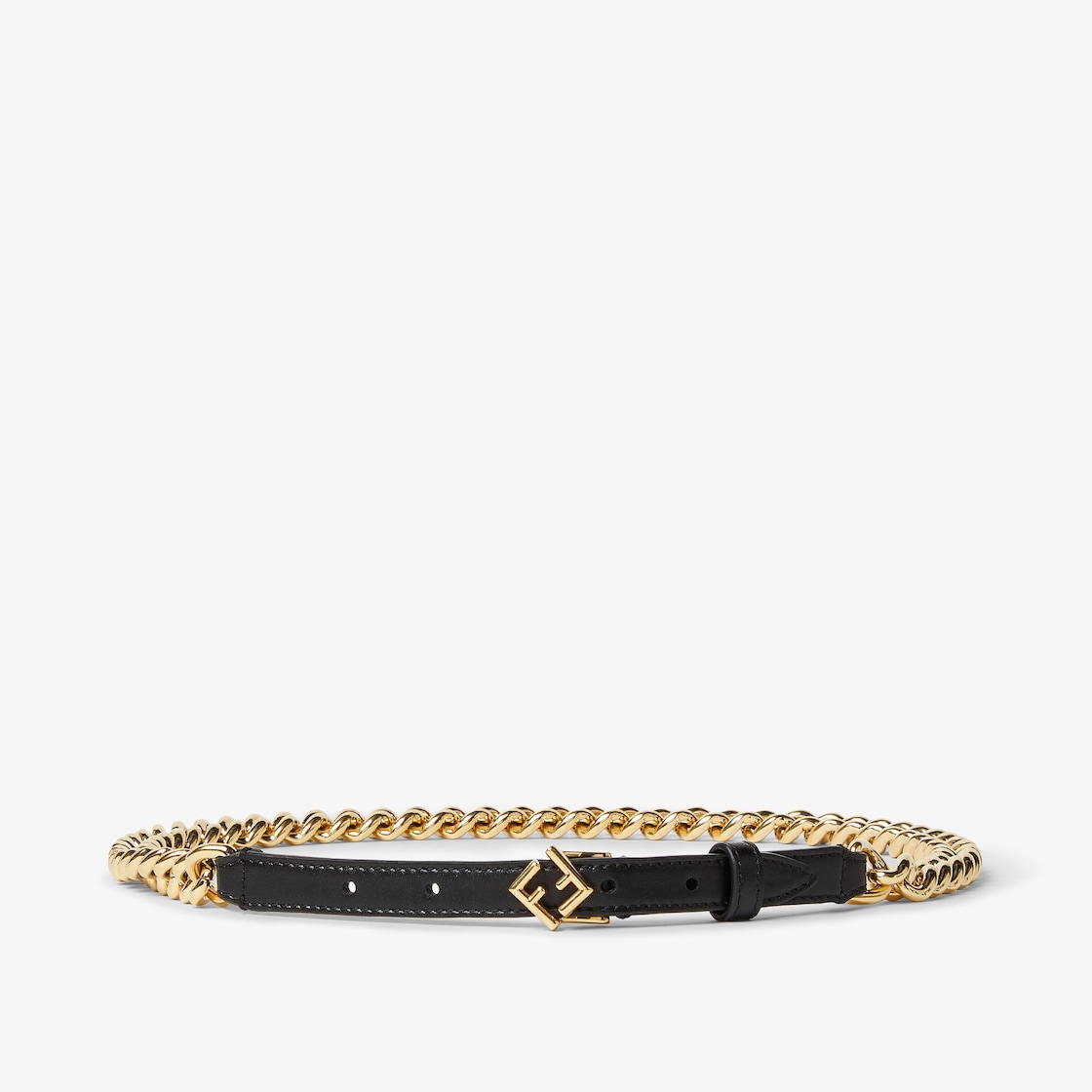 Kettengürtel mit Einsatz aus Leder in Schwarz. Gürtel mit FF Diamonds Schließe und Schlaufe aus Leder. Beschläge aus Metall mit Finish in Gold-Optik.