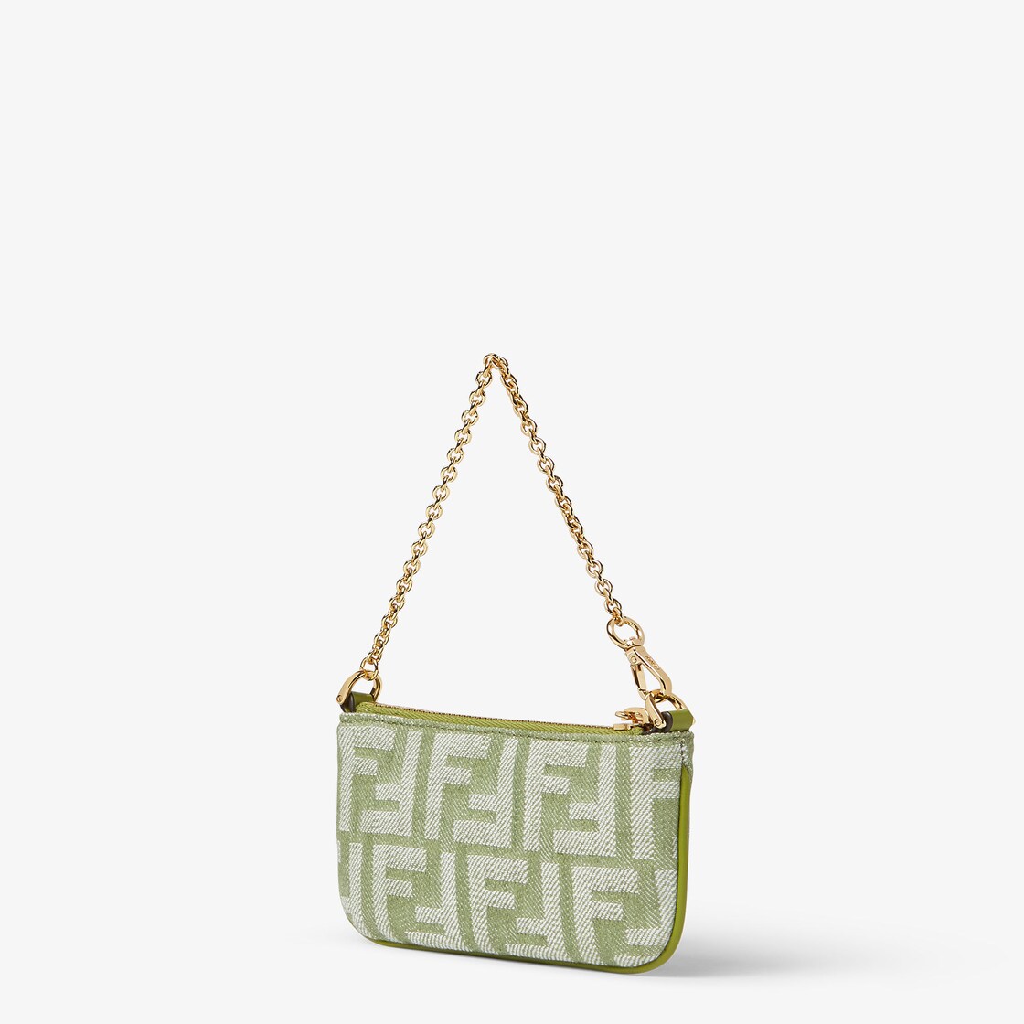 Schmale Mini-Pochette Baguette mit Reißverschluss und Schieber in Form des ikonischen FF-Motivs. Kurzer Ketten-Schulterriemen aus Metall, der sich mit einem Karabinerhaken öffnen lässt. Gefüttert. Aus FF-Jacquard und Denim-Effekt in Eisenkrautgrün. Details aus Ton-in-Ton-Leder entlang der Kanten. Beschläge aus Metall mit Finish in Gold-Optik.