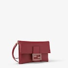Pochette Mamma Baguette mit weicher Klappe, verziert mit FF-Schließe mit Einsatz aus Ton-in-Ton-Leder. Gefüttert. Dank dem praktischen Handgelenksriemen aus Leder und dem abnehmbaren Ketten-Schulterriemen kann sie als Handtasche oder Schultertasche getragen werden. Aus weichem Nappaleder in Burgund. Beschläge aus Metall mit Finish in Gold-Optik.