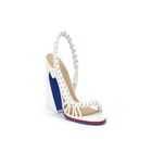Asymmetrische Sandale mit breitem Absatz mit dem ikonischen, geschwungenen Arco-Motiv. Aus Leder in Weiß mit handgefertigtem Flechtwerk, das von Fallschirmknoten inspiriert ist. Sohle aus zweifarbigem Gummi mit FF-Design in Blau und Weiß und Absatzunterseite aus Gummi in Weiß. Detail aus lackiertem Metall in Blau an der Ferse und graviertes Fendi-Logo.