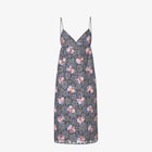 Slipkleid mit V-Ausschnitt und schmalen Trägern. Reißverschluss am Rücken über die gesamte Länge. Gefertigt aus Spitze in Grau mit einem Archiv-Blumenmotiv mit transparenter Optik. Mit kontrastierendem Fendi Bouquet Print in Rosa und Hellblau. Passendes Unterkleid in Grau, das mittels Druckknopf abnehmbar ist.