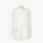 Langärmliges Hemd mit abgerundeten Seitenschlitzen. Mittige Falte am Rücken und Manschetten mit Knöpfen. Verdeckter Knopfverschluss. Aus Seidenorganza in Weiß mit Fendi Ajour Motiv und farblich abgestimmten Profilen. Die Cut-Out-Details und die kontrastierenden Texturen erzeugen einen dreidimensionalen Effekt mit starker visueller Wirkung.