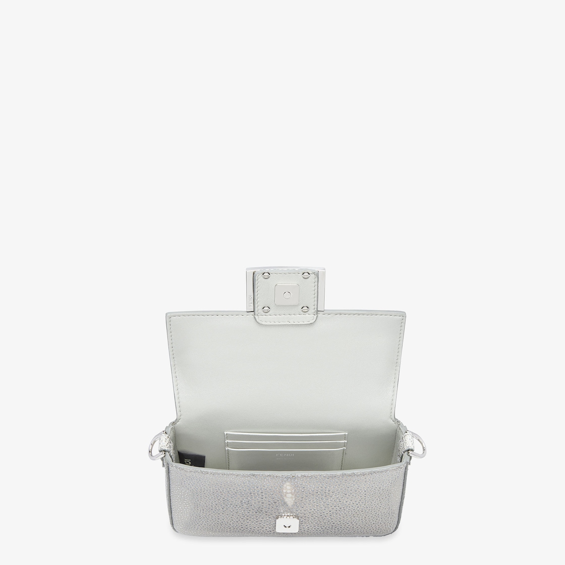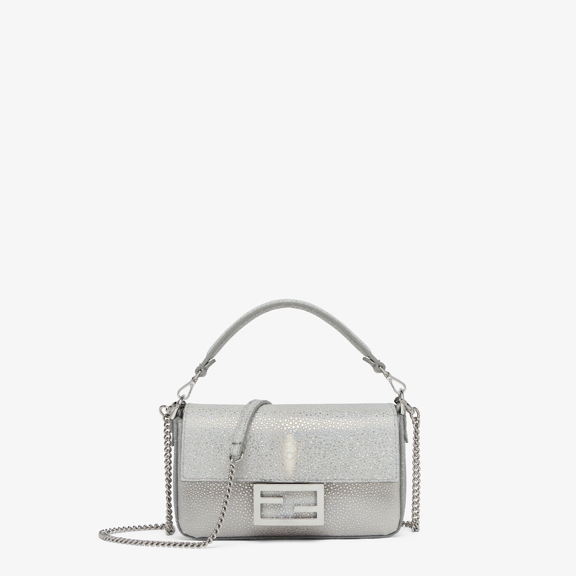 Ikonische Baguette Tasche in kleiner Größe, aus hochwertigem Leder in Metallic-Optik in der Farbe Silber, mit FF-Verschluss veredelt.