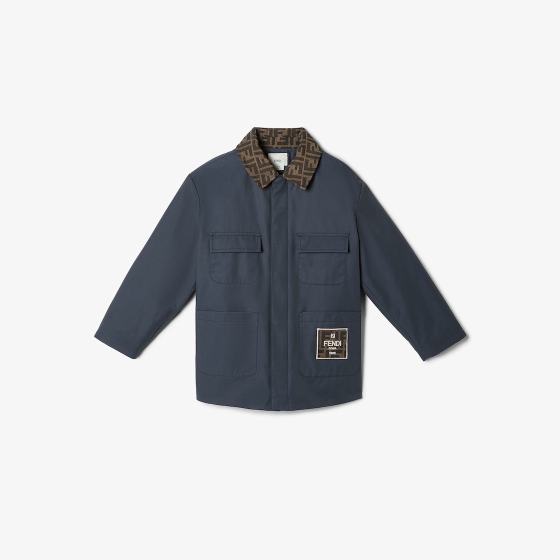 Kurze Junior-Parkajacke aus Gabardine in Waldgrün mit Kragen aus FF-Logo-Jacquard, Vordertaschen und Logo-Patch in Tabakfarben auf der Vorderseite.