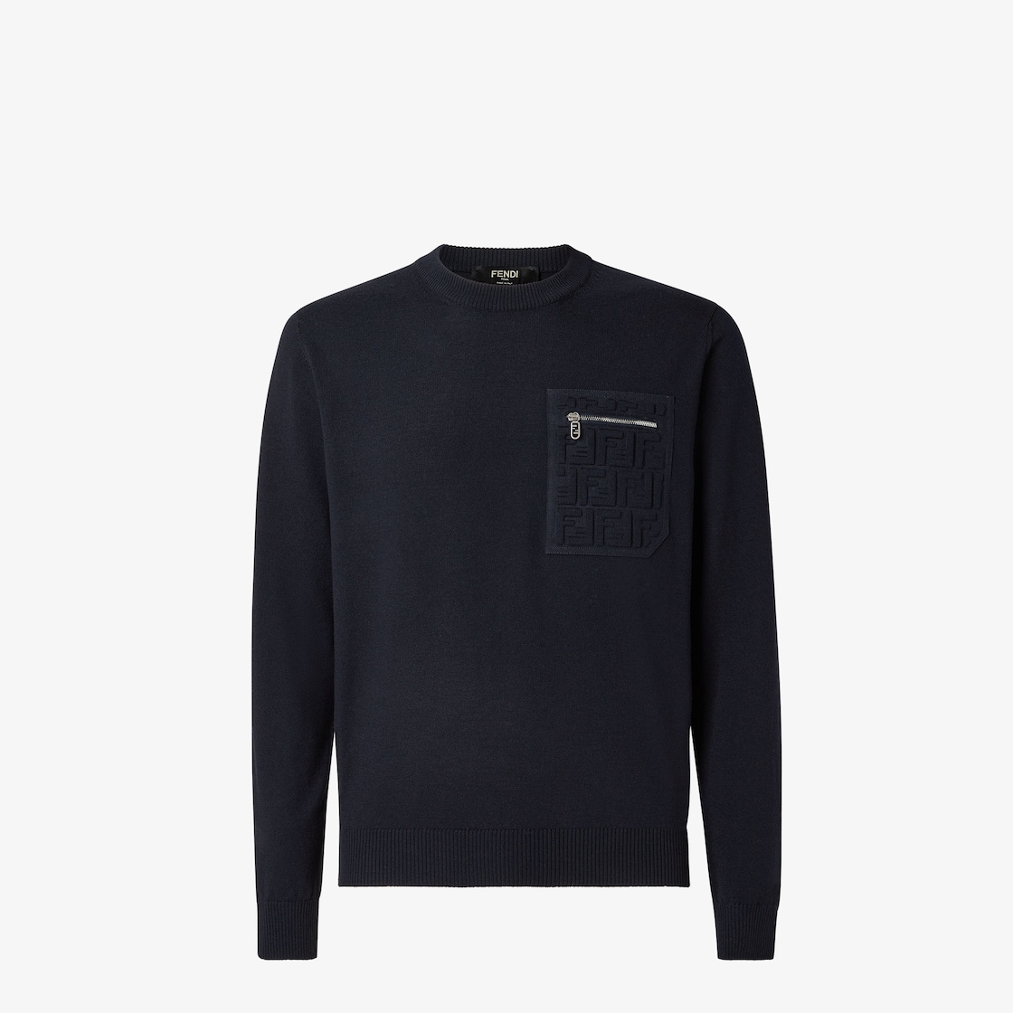 Langärmliger Pullover mit Rundhalsausschnitt. Regular Fit. Aus Wollgarn in Marineblau. Die Brusttasche mit Reißverschluss ist mit einem FF-Relief im selben Farbton verziert, der Reißverschlussschieber ist mit dem Fendi O’Lock-Schriftzug aus Metall in Palladium-Optik versehen.