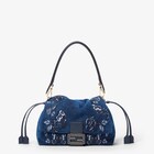 Made of blue denim with a flocked texture, embellished with butterflies embroidered in yarn, beads and sequins. Embellished with an FF clasp with dark blue leather insert.