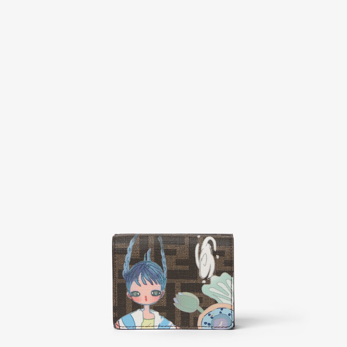 Fendi Roma medium tri-fold wallet. Divided into six card slots, a banknote compartment and a coin pocket with a press stud button. Part of the “Fantastic Fendi Future” capsule collection designed in collaboration with Japanese artist AYA TAKANO and made of tobacco brown FF fabric with a multicolour Fantastic Future Girls print. Palladium-finish metalware.