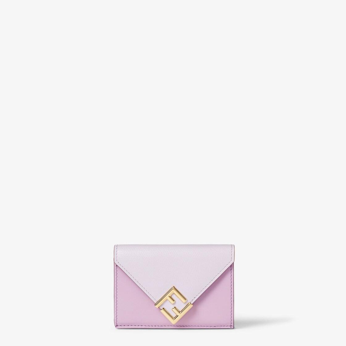 Compact trifold FF Diamonds wallet, with large internal compartment for banknotes, six card slots and an external coin purse with press-stud fastening. Made of smooth calfskin and full-grain leather in lilac and light lilac. Gold-finish metalware and FF Diamonds logo.