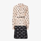 Midi shirt dress with shirt collar and cuffs. Breast pocket and patch pockets on the sides. Waistline seam and pleated skirt. Visible button fastening to the waist. Made of pink and black taffeta with a trompe-l’oeil effect. The Falena Dots motif is printed all over in contrasting tones. Fastening with two matching belts: one with a metal FF buckle, the other with a matching-tone covered buckle.