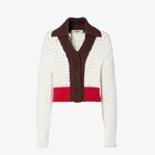 Long-sleeved V-neck cardigan. Fastening with three knit-covered buttons. Made of white cotton yarn in a chunky knit with a woven effect. Brown ribbed collar and placket, red ribbed hem. White leather patch with FF Selleria detail on the back of the collar.