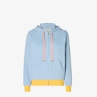 Sweatshirt with drawstring hood and pouch pockets on the front. Zip fastening. Made of light blue cotton and silk yarn with the iconic FF motif lightly embossed all over in the same tones. Yellow ribbed cuffs and hem and contrasting pink drawstring.