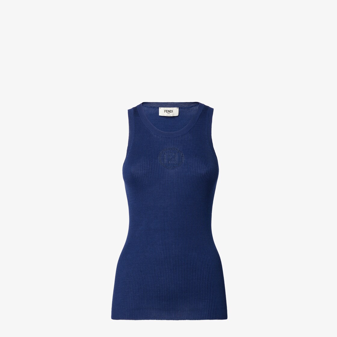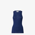Sleeveless slim-fit top. Borders embellished with ribbing. Made of navy blue cotton yarn in a seamless rib knit. Decorated with lace-effect micro-perforated Fendi Stamp 1925 motif on the front.