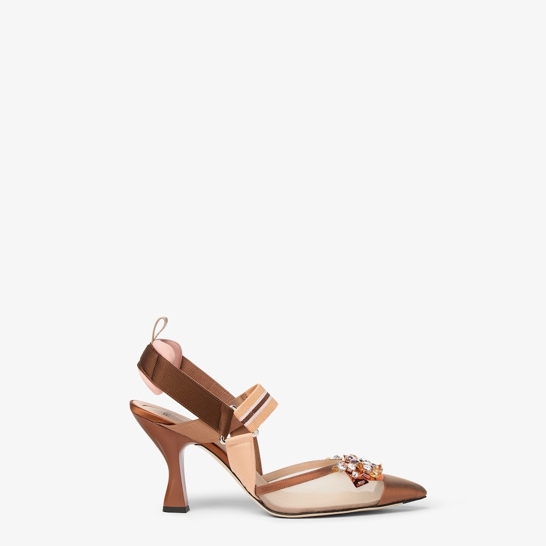 Streamlined and feminine Colibrì slingbacks with elasticated straps that wrap around the foot. The sole is embellished with rubber inserts. Made of nude mesh and embellished with hand-sewn embroidery with long fringe hanging from the geometric shape. The addition of set stones creates a three-dimensional effect and a play on light. The padded cushion and hiking shoe tab add a sporty touch. Copper-coloured lacquered heel.