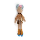 Emma maxi charm in Alcantara with light blue twisted shearling hair and applied pink and light blue leather flowers. Honey-coloured shaved mink coat featuring a Fendi Pequin motif with leather threading. Leather earrings and Baguette in raffia with brown leather details. Lycra underwear and light blue sandals woven with leather.