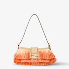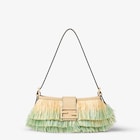 Covered with three layers of natural-coloured raffia-effect material fringe, hand-dyed to create a light green faded effect. Embellished with a beige leather FF clasp and finished with hand-sewn light blue topstitches, an emblem of the iconic Selleria stitching handed down through generations of Fendi artisans since 1925.