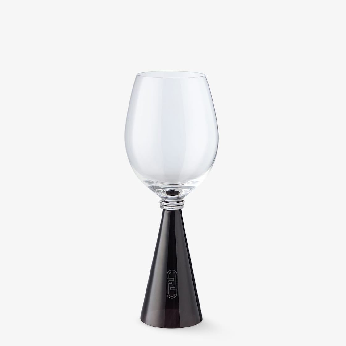 Collection of Fendi Casa crystal glasses with black conical base. Symbolic of refined creative intuition, since 1987, this line of glasses takes inspiration directly from Anna Fendi's private collection. The careful attention to detail is evident in the delicate decoration with the gold-coloured Fendi O’Lock logo. Unique, sophisticated glasses created to make every dining experience special.
